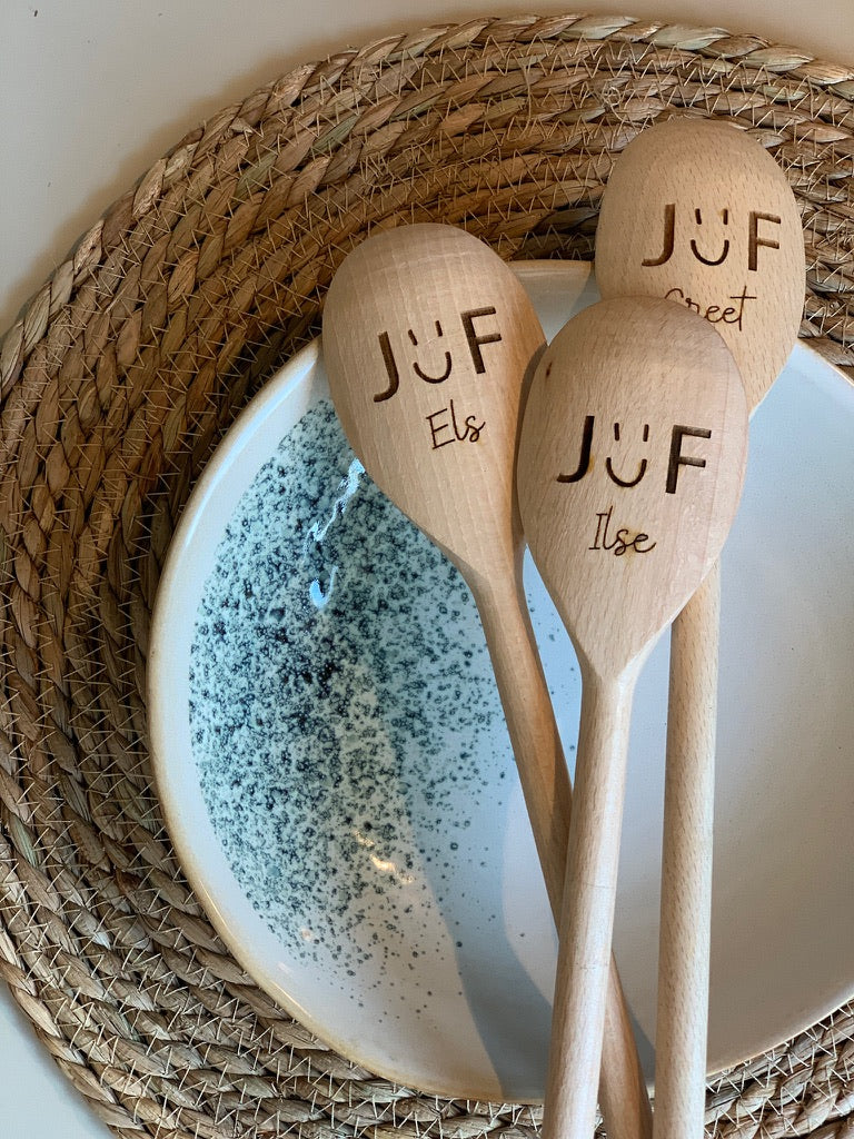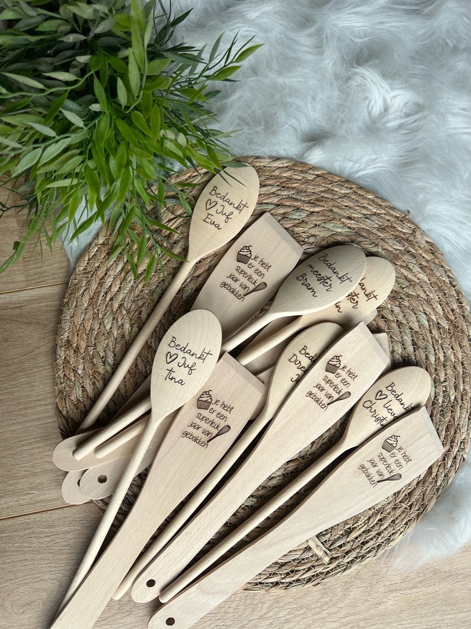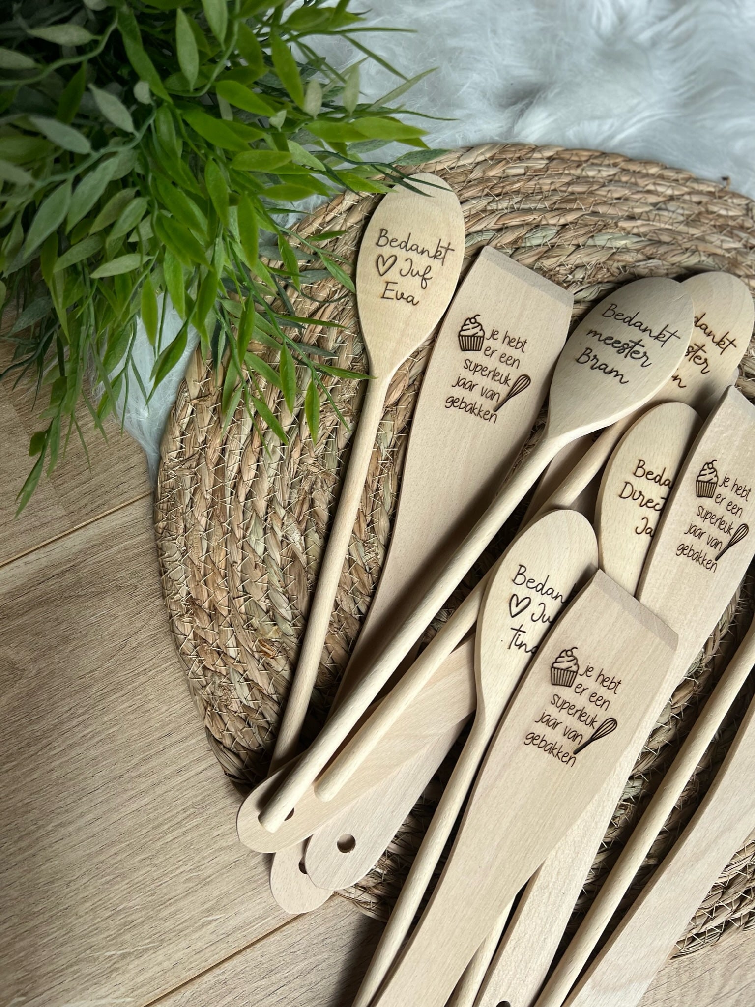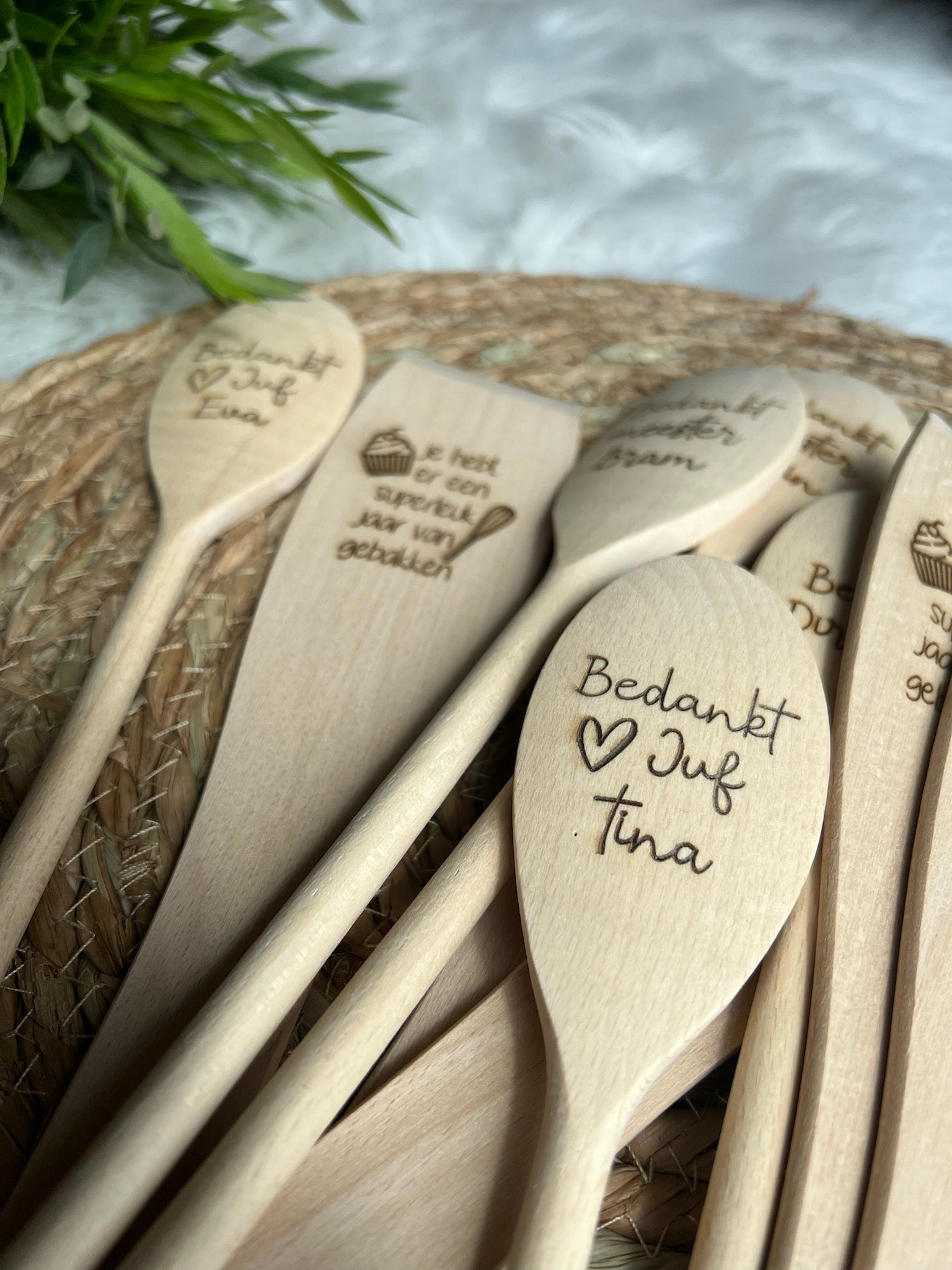 Houten lepel met opschrift naar keuze. Stuur ons tijdens of na de bestelling een berichtje met het het opschrift en het gewenste lettertype.
