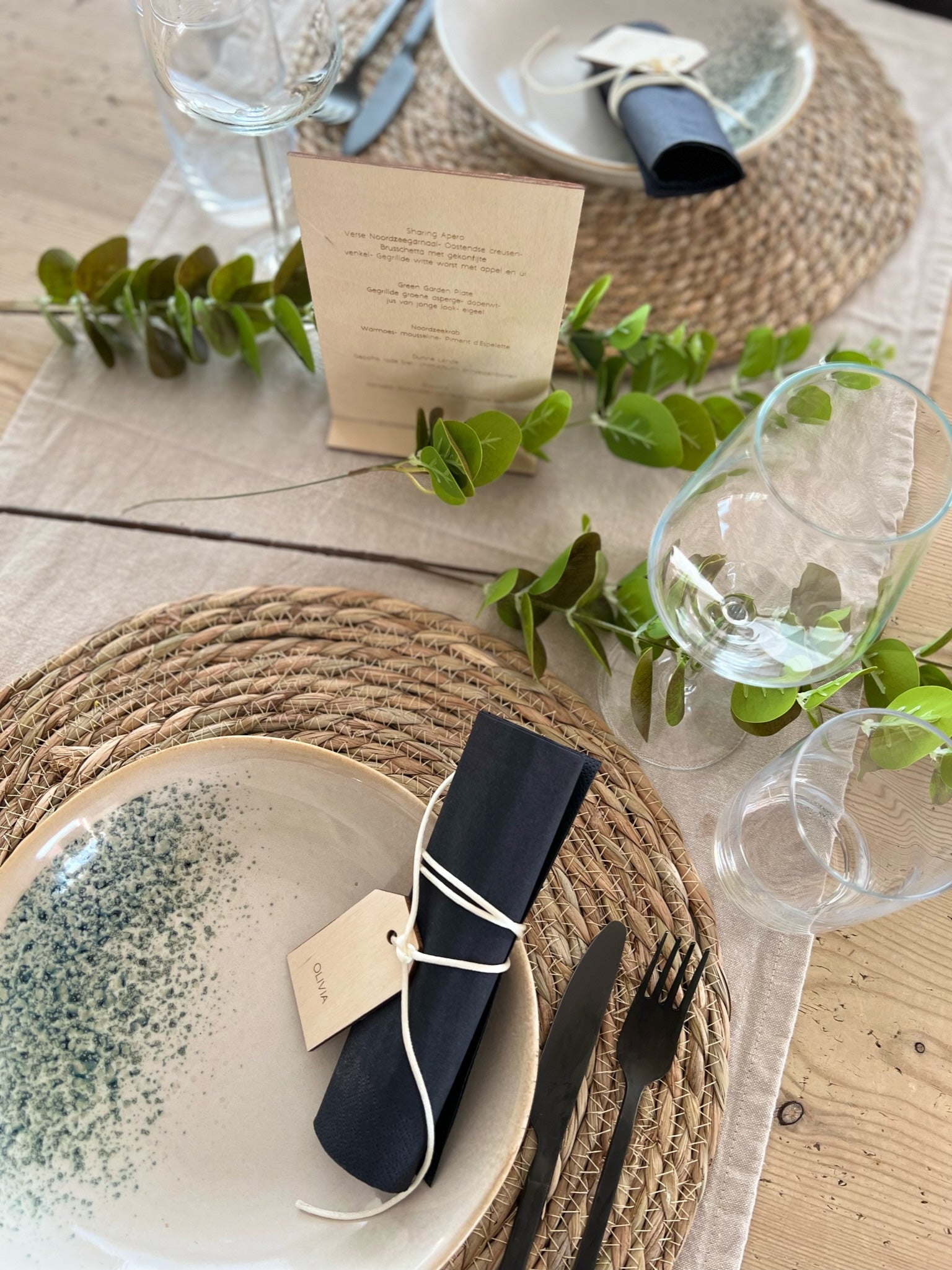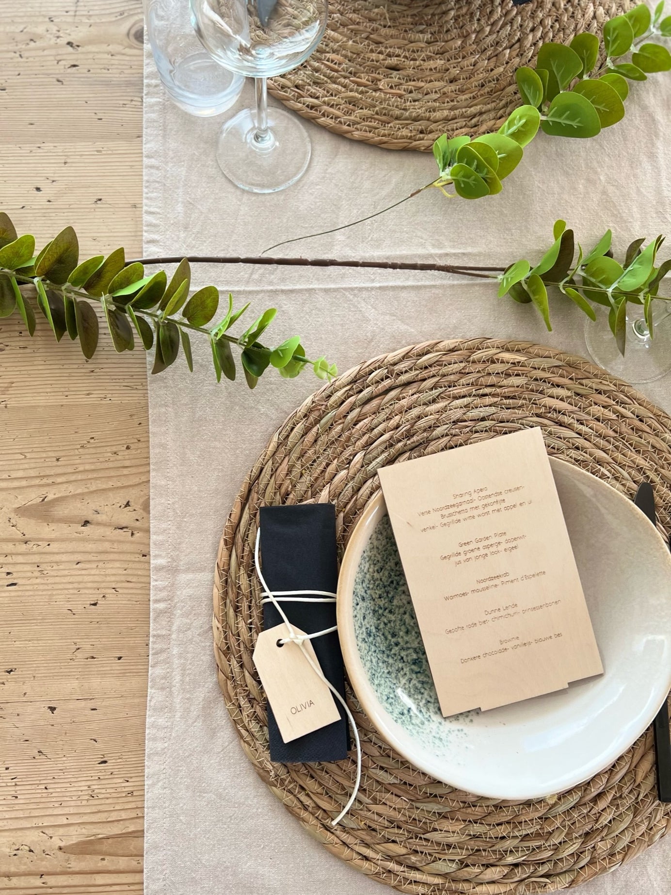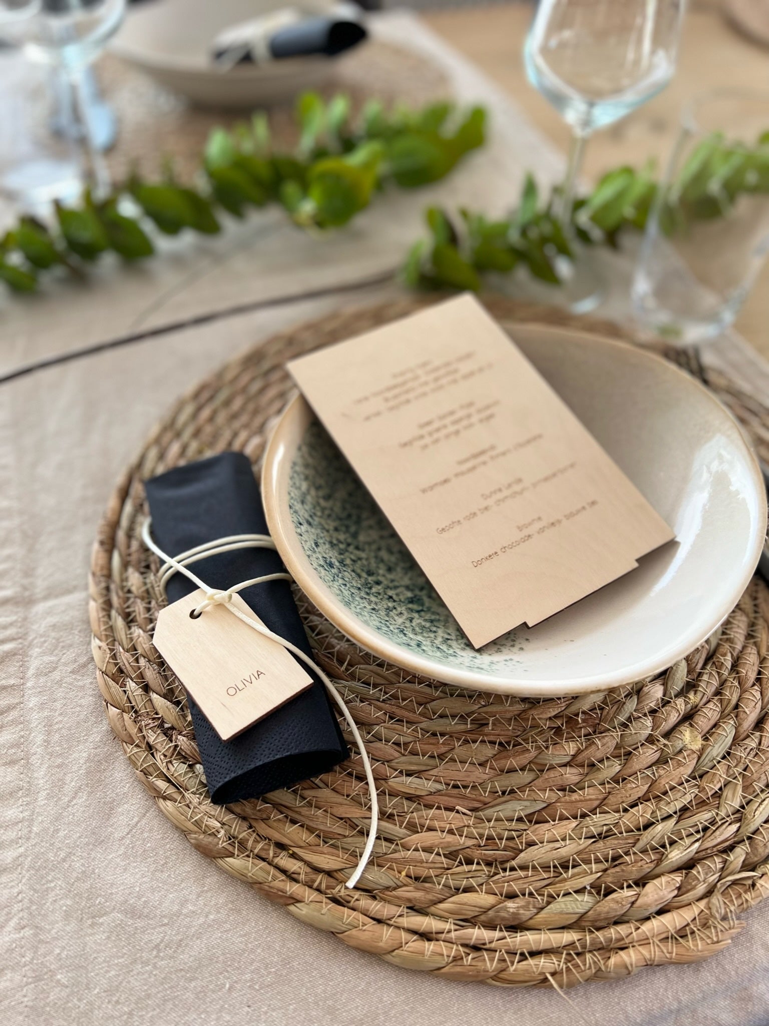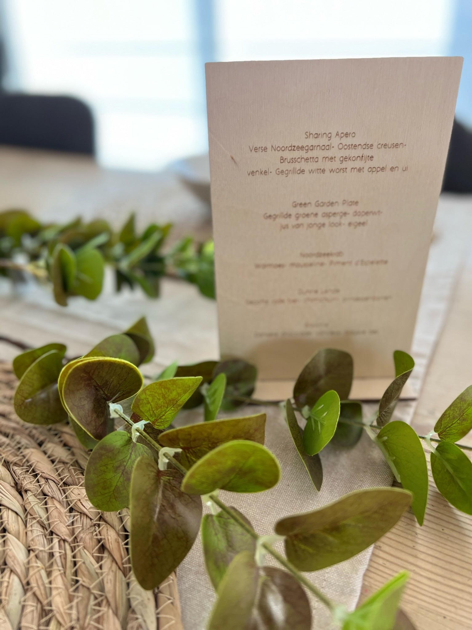 Deze houten menukaarten geven een authentieke en premium uitstraling door de natuurlijke textuur van hout. Maak indruk op je evenement of menu met deze prachtige uitgesneden én gebrande spijskaart.