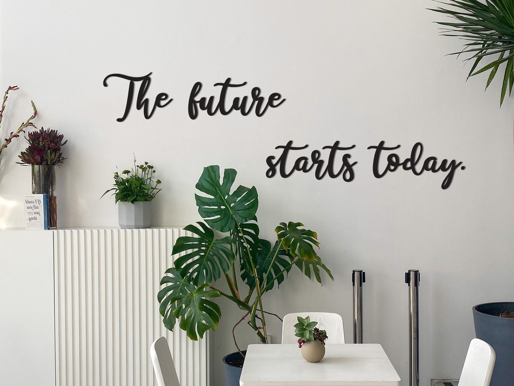 Afhankelijk het aantal letters wordt de totale hoogte bepaald tegenover de lengte van het woord/zin. Doorgaans is dit tussen de 10cm en 40cm hoog. We sturen sowieso een visueel voorbeeldje vóór we aan de slag gaan.