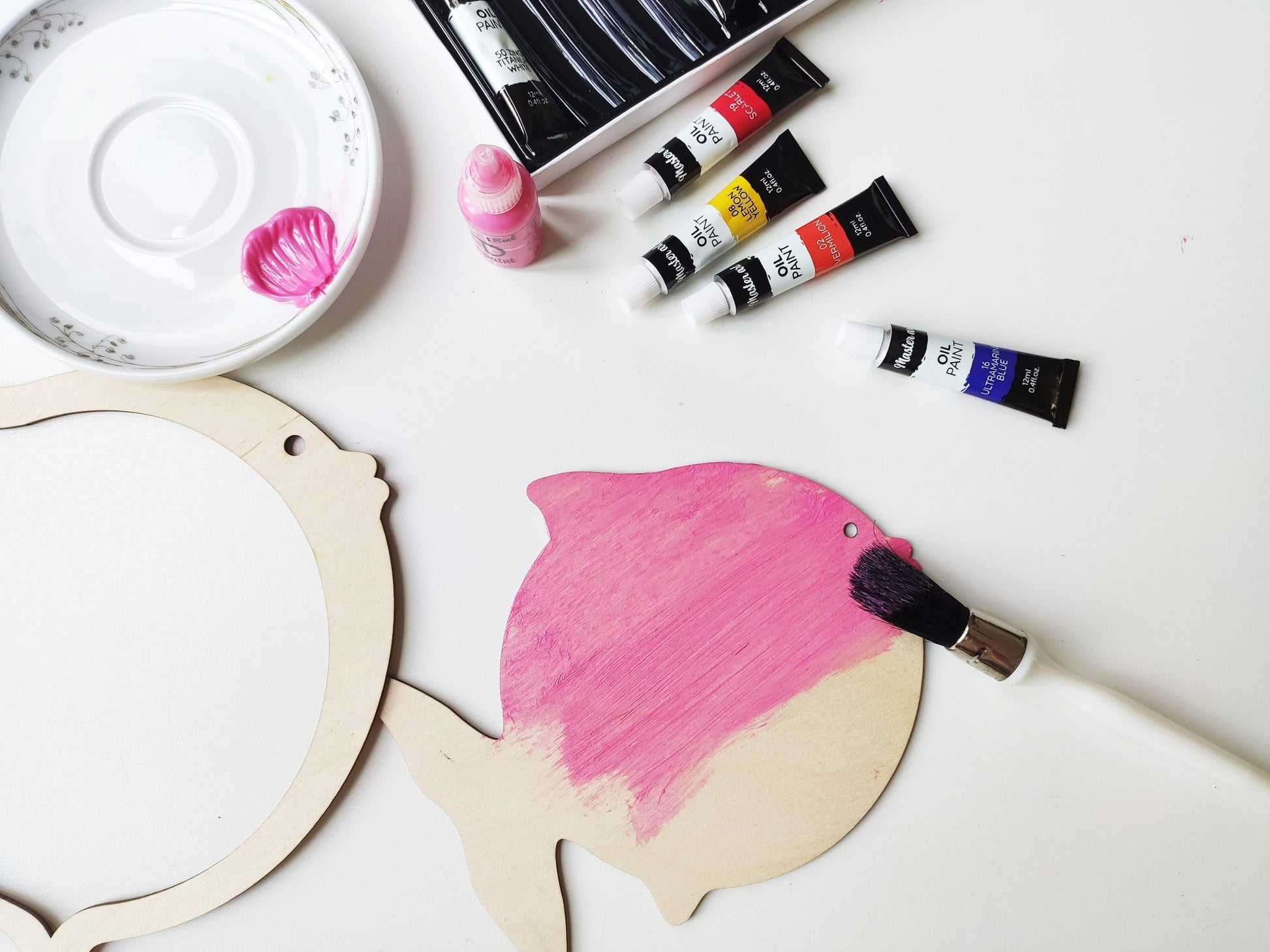 - Houten wandfiguur van 3 vissen en 6 luchtbellen
