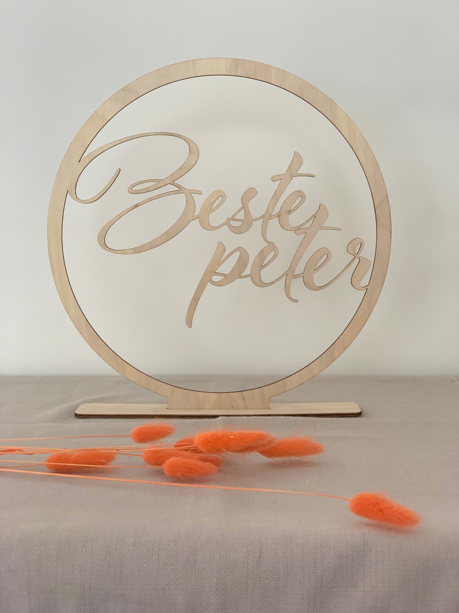 Geef de naam / logo / tekst, voorkeur van lettertype, en eventueel het kleur van de bloemen door na bestelling.