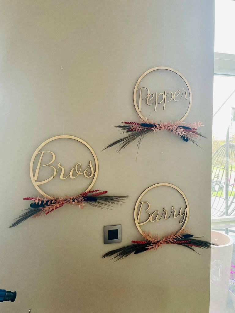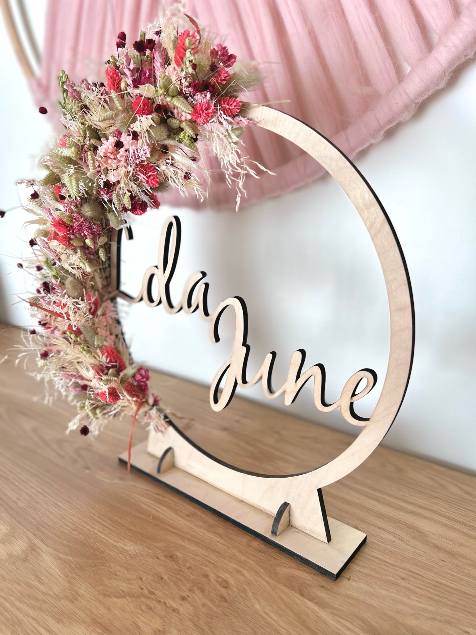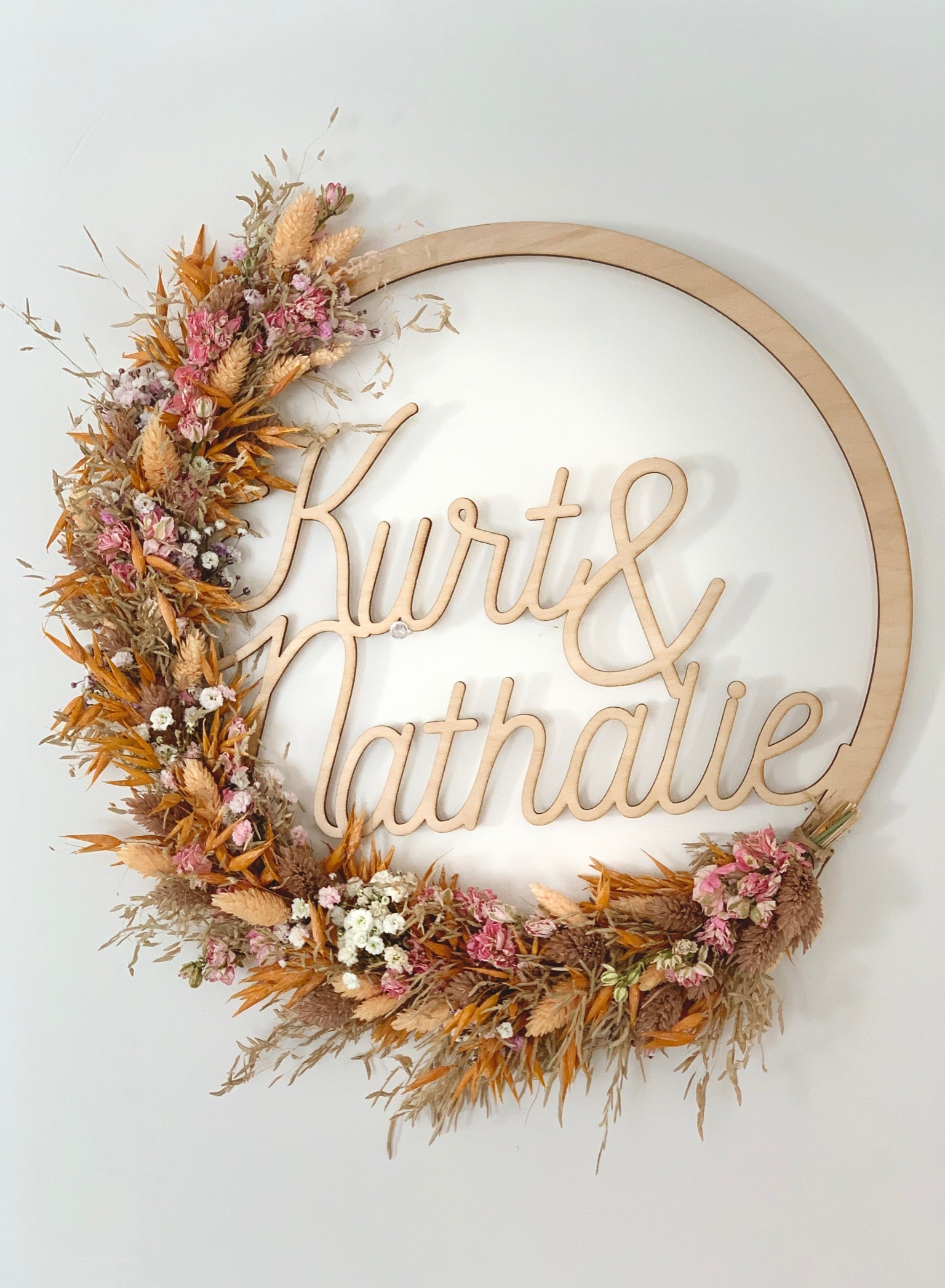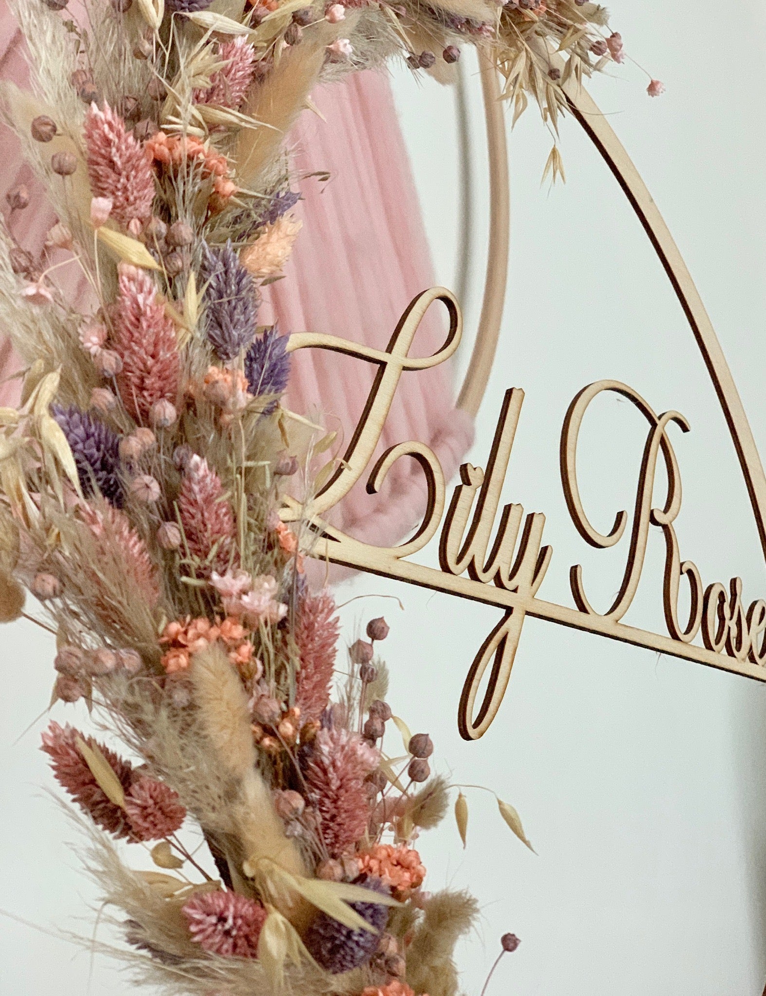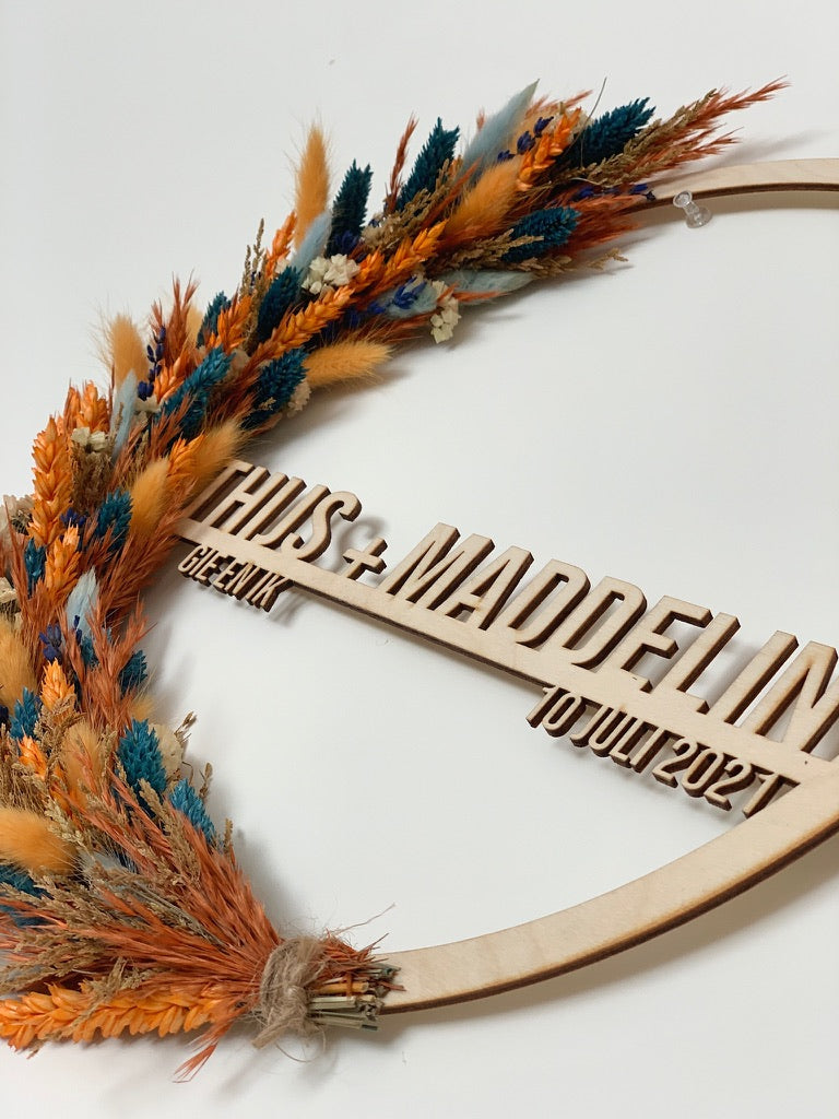 Deze hoepels en cirkels kunnen volledig worden aangepast; van de naam tot het lettertype en de afmetingen. Onze eigen bloemiste kiest voor u de mooiste droogbloemen.