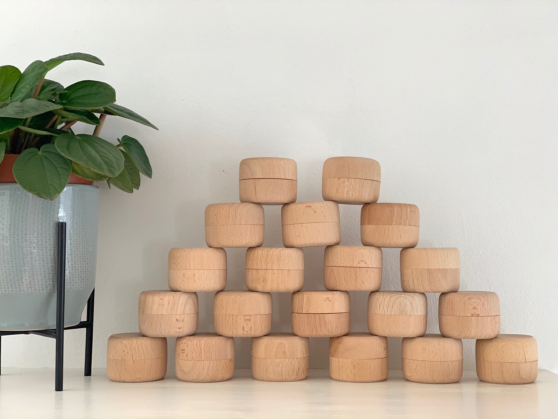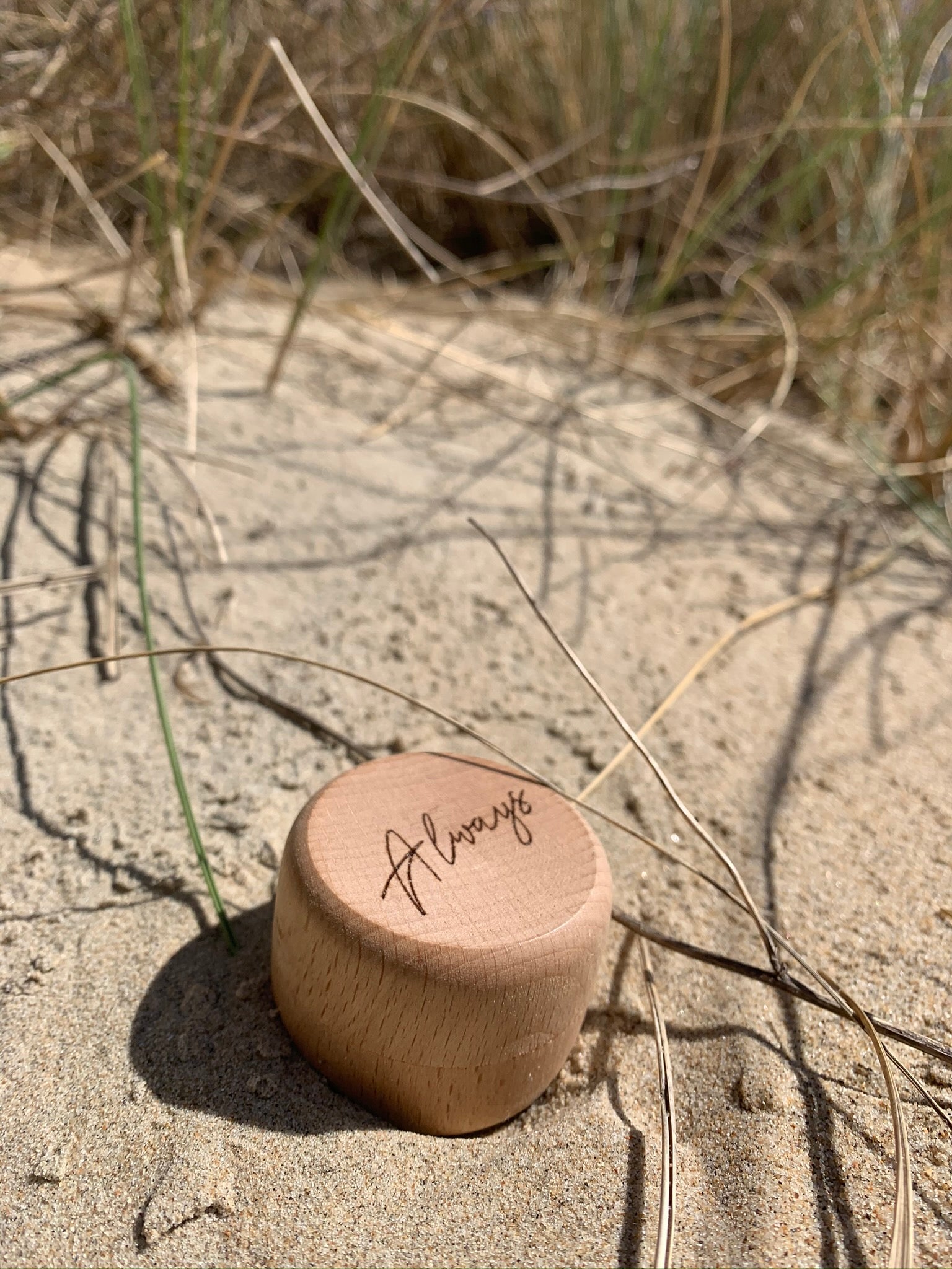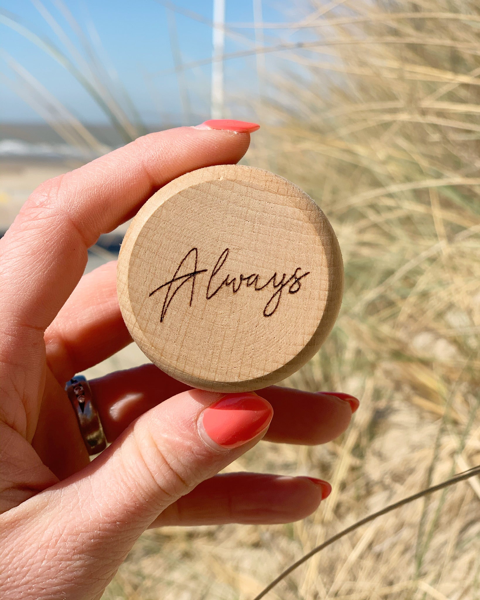 Houten rond potje om oa. melktanden of andere souvenirs te bewaren met gegraveerde persoonlijke boodschap. Diameter 5cm.